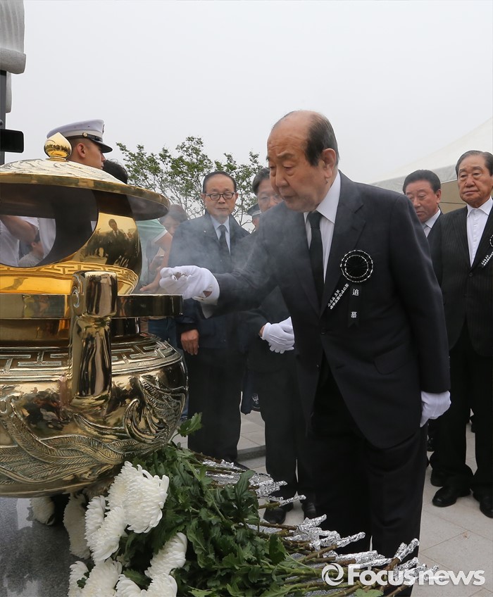 (서울=포커스뉴스)26일 오후 서울 동작구 국립현충원에서 열린 고 김영삼 전 대통령 묘비 제막식에서 김수한 전 국회의장 등 원로 정치인들이헌화 및 분향을 하고 있다.