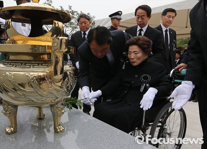 (서울=포커스뉴스)26일 오후 서울 동작구 국립현충원에서 열린 고 김영삼 전 대통령 묘비 제막식에서 고 김 전 대통령의 부인 손명순 여사가 헌화 및 분향을 하고 있다.