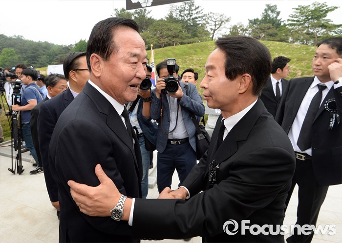 (서울=포커스뉴스) 새누리당 서청원(왼쪽) 의원이 26일 오후 서울 동작구 국립현충원에서 열린 故 김영삼 전 대통령 묘비 제막식에 참석해 차남 김현철씨와 인사를 하고 있다.