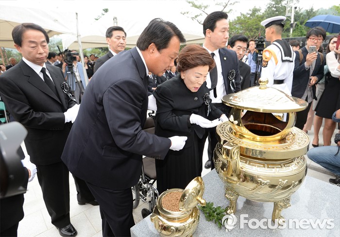 (서울=포커스뉴스) 26일 오후 서울 동작구 국립현충원에서 열린 고 김영삼 전 대통령 묘비 제막식에서 부인 손명순 여사가 분향을 하고 있다.