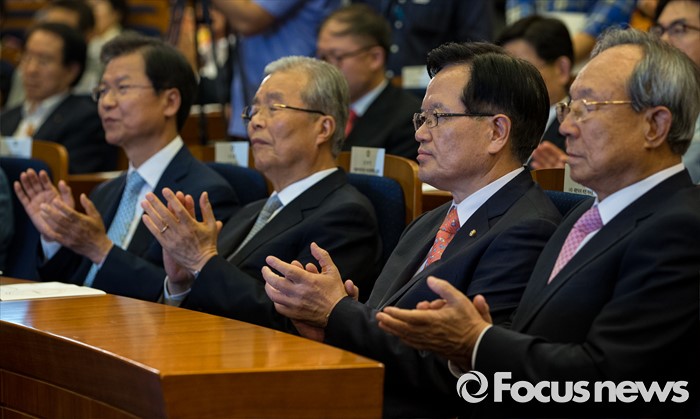 (서울=포커스뉴스) 26일 오후 서울 여의도 국회 헌정기념관에서 열린 '새한국의 비전' 창립 기념식에서 천정배(앞줄 왼쪽부터) 국민의당 공동대표, 김종인 더불어민주당 비상대책위 대표, 정의화 국회의장, 박관용 전 국회의장 및 참석자들이 박수치고 있다.