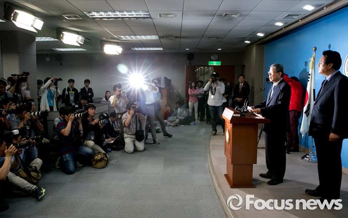 (서울=포커스뉴스) 새누리당 혁신비대위원장에 내정된 김희옥(왼쪽) 전 동국대 총장과 정진석 원내대표가 26일 오후 서울 여의도 국회 정론관에서 기자회견을 하고 있다.