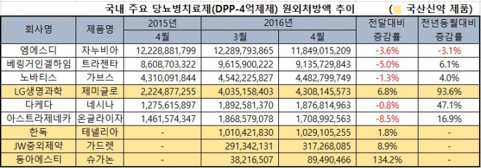 우선 대웅제약과 손을 잡은 LG생명과학 제미글로군의 원외처방액이 크게 증가했다. 대웅제약은 강한 영업력을 토대로 자누비아군을 시장 1위로 만든바 있다.