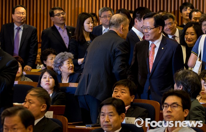 (서울=포커스뉴스) 26일 오후 서울 여의도 국회 헌정기념관에서 열린 '새한국의 비전' 창립 기념식에 참석한 정의화 국회의장이 참석자들과 악수하고 있다.