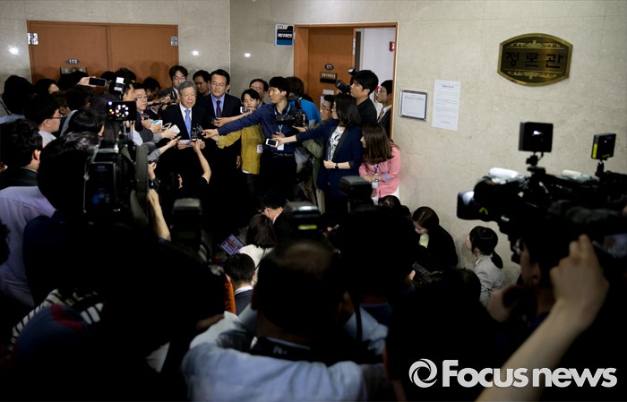 (서울=포커스뉴스) 새누리당 혁신비대위원장에 내정된 김희옥(왼쪽) 전 동국대 총장과 정진석 원내대표가 26일 오후 서울 여의도 국회 정론관에서 기자회견을 마친 뒤 취재진 질문에 답하고 있다.
