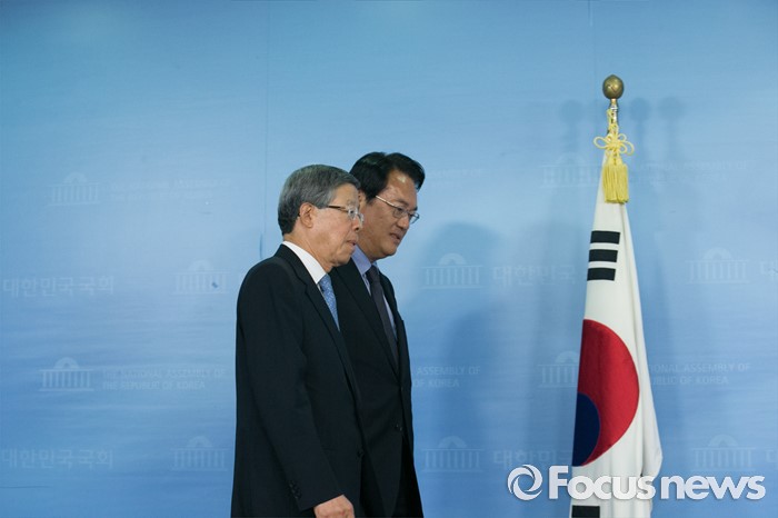 (서울=포커스뉴스) 새누리당 혁신비대위원장에 내정된 김희옥(왼쪽) 전 동국대 총장과 정진석 원내대표가 26일 오후 서울 여의도 국회 정론관에서 기자회견을 위해 입장하고 있다.
