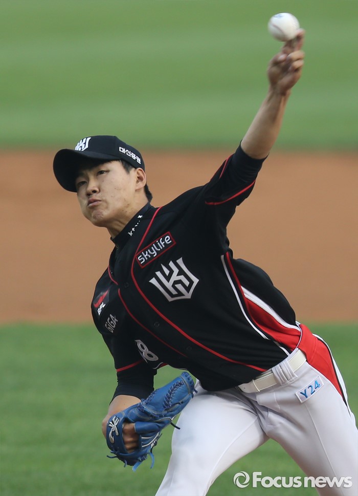 힘차게 공을 던지는 kt 선발 정성곤의 투구