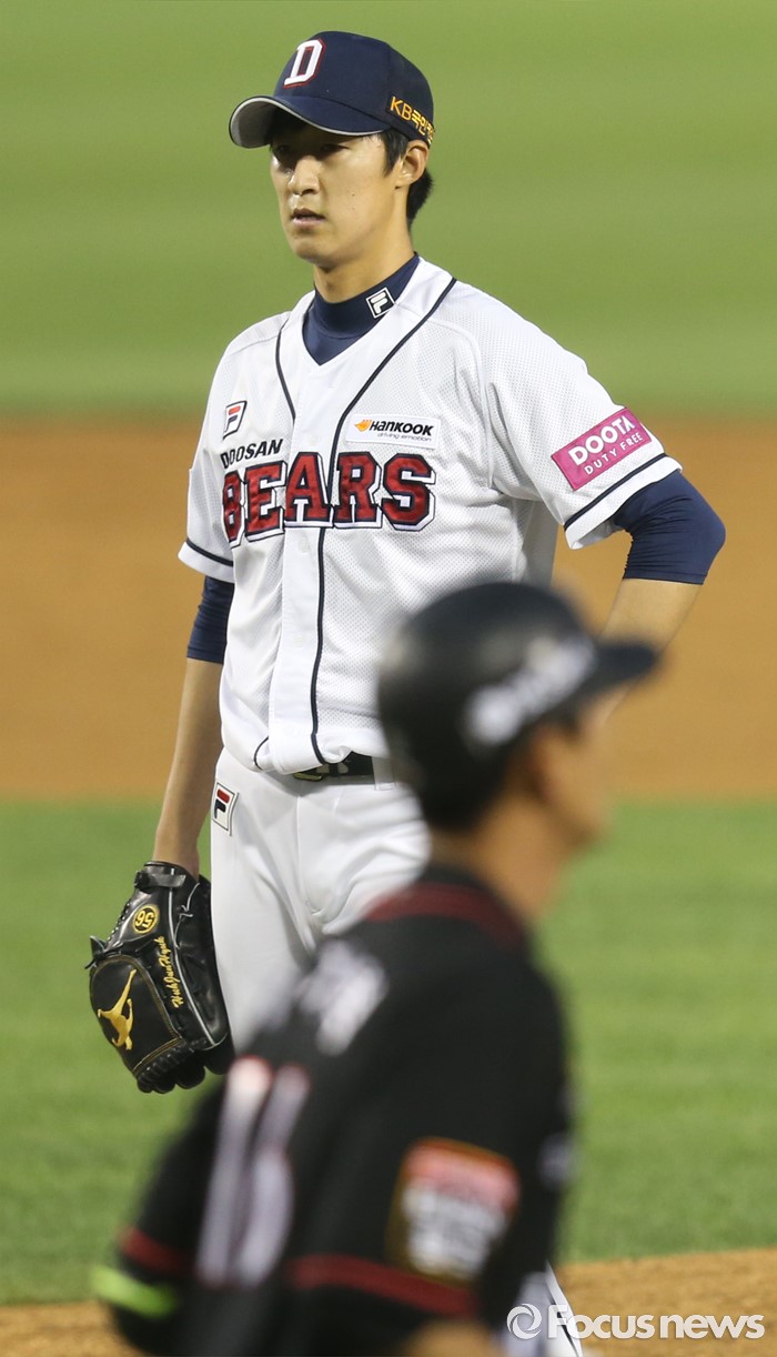 (서울=포커스뉴스) 26일 서울 잠실구장에서 열린 2016프로야구 kt-두산 경기 4회초 1사 1,2루에서 두산 투수 허준혁이 kt 박기혁을 몸에 맞는 볼로 진루시키며 아쉬워하고 있다.