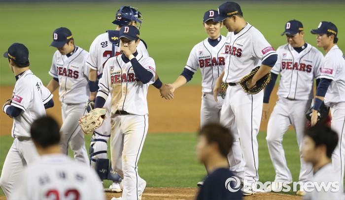 (서울=포커스뉴스) 26일 서울 잠실구장에서 열린 2016프로야구 kt-두산 경기에서 kt와의 3연전을 싹쓸이한 두산 선수들이 마운드에서 하이파이브하며 승리의 기쁨을 함께하고 있다.