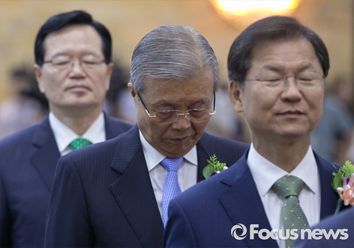 (서울=포커스뉴스) 27일 오전 서울 여의도 국회에서 열린 68주년 국회 개원 기념식에 참석한 천정배(오른쪽부터) 국민의당 공동대표, 김종인 더불어민주당 비대위 대표, 정의화 국회의장 등 참석자들이 애국가를 부르기 전 생각에 잠겨 있다.