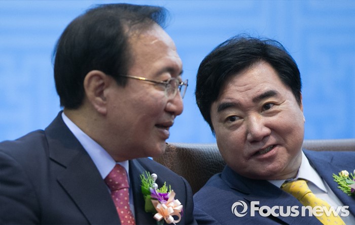 (서울=포커스뉴스) 27일 오전 서울 여의도 국회에서 열린 68주년 국회 개원 기념식에 참석한 이석현(오른쪽) 국회 부의장과 노회찬 정의당 원내대표가 대화하고 있다.