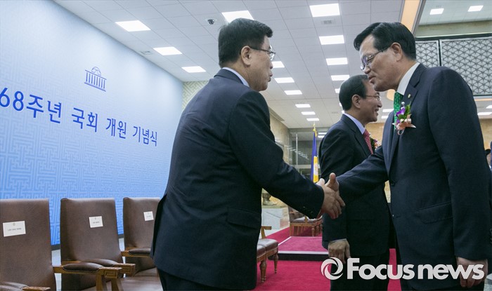 (서울=포커스뉴스) 27일 오전 서울 여의도 국회에서 68주년 국회 개원 기념식을 마친 정의화(오른쪽) 국회의장이 김광림 새누리당 정책위의장과 인사하고 있다.
