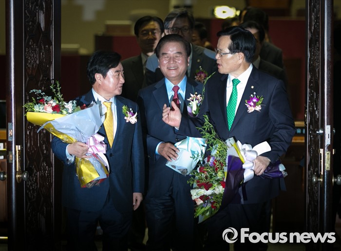 | △ 꽃다발 든 국회의장과 국회 부의장 |