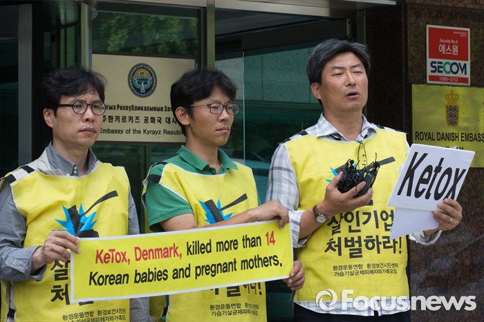 (서울=포커스뉴스) 환경보건시민센터 관계자들이 27일 오전 서울 용산구 주한 덴마크대사관 앞에서 가습기살균제 사건 관련 덴마크 정부 행동 촉구 항의서한 전달 기자회견을 하고 있다.