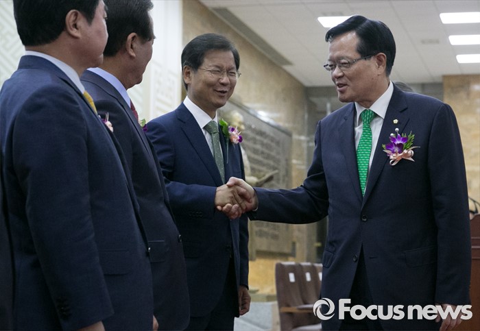 (서울=포커스뉴스) 27일 오전 서울 여의도 국회에서 68주년 국회 개원 기념식을 마친 정의화 국회의장이 정당 참석자들과 인사하고 있다. 오른쪽부터 정 의장, 천정배 국민의당 공동대표, 정갑윤, 이석현 국회 부의장.