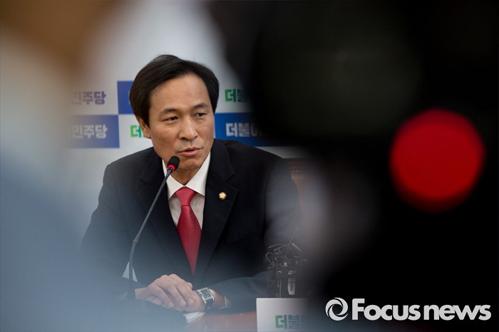 (서울=포커스뉴스) 우상호 더불어민주당 원내대표가 27일 오전 서울 여의도 국회에서 국회법 개정안 관련 대통령 거부권 행사에 대해 입장발표 하고 있다.