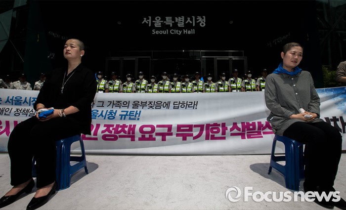 (서울=포커스뉴스)27일 오전 서울 중구 서울시청 앞에서 전국 장애인 부모연대와 서울특수학교학부모협의회 회원들이 발달장애인 정책 수립을 촉구하는 삭발식이 열리고 있다.