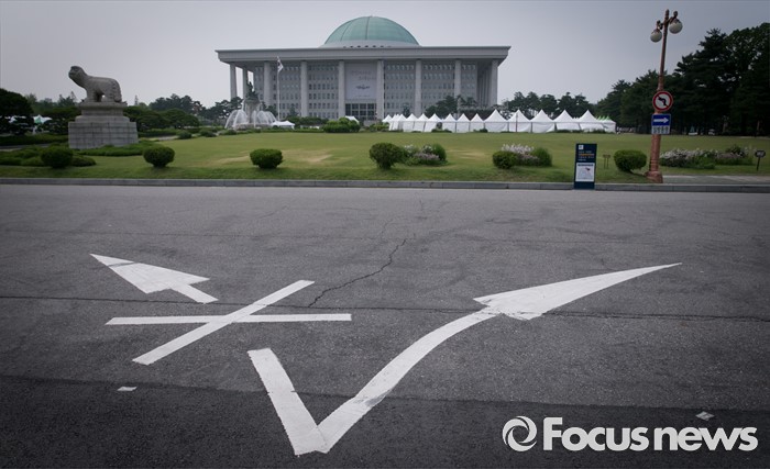 (서울=포커스뉴스) 정부가 상시 청문회 등의 내용이 포함된 국회법 개정안에 대해 거부권을 행사해 여야가 입장 차이를 보이고 있는 27일 오후 서울 여의도 국회 경내 도로에 양갈래로 표시된 화살표가 보이고 있다.