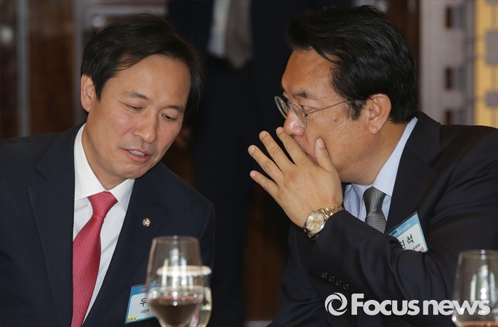 (서울=포커스뉴스) 27일 오후 서울 웨스틴 조선호텔에서 열린 2016 한반도통일 심포지엄 기념 오찬에 참석한 정진석(오른쪽) 새누리당 원내대표와 우상호 더불어민주당 원내대표가 대화하고 있다.