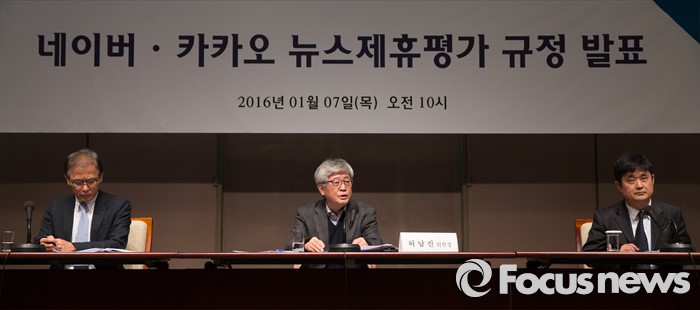 평가 항목은 뉴스검색제휴와 동일하며, 평가위의 최고점수와 최저점수를 제외한 평균 점수 80점 이상, 뉴스콘텐츠제휴는 평균 점수 90점 이상인 경우 통과 가능하다.(서울=포커스뉴스) 인터넷 포털 네이버와 카카오의 뉴스 제휴 심사를 담당할 '뉴스제휴평가위원회'가 7일 오전 서울 중구 프레스센터에서 '네이버-카카오 뉴스 제휴 및 제재 심사 규정'을 발표하는 기자간담회를 진행하고 있다. 배정근 제 1 소위원장, 허남진 위원장, 김병희 제 2 소위원장(왼쪽부터)이 세부 규정에 대해 발표하고 있다. 발표한 규정은 3월 1일부터 시행된다. 2016.01.07 김흥구 기자