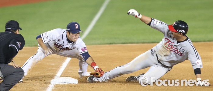 (서울=포커스뉴스) 27일 서울 잠실구장에서 열린 2016프로야구 LG-두산 경기 5회초 2사 1루에서 LG 임훈의 좌중간 안타때 1루주자 박용택이 3루에서 태그아웃되고 있다.