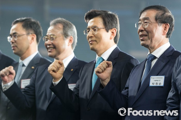 (서울=포커스뉴스) 2016 전국생활체육대축전 개막식이 열린 27일 오후 서울 송파구 잠실 올림픽주경기장에서 내빈들이 포즈를 취하고 있다. 왼쪽 두 번째부터 강영중 대한체육회장, 황교안 국무총리, 박원순 서울시장.