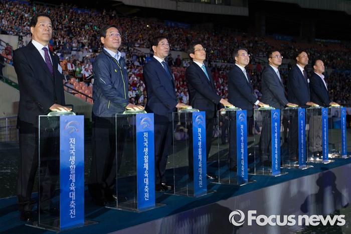 (서울=포커스뉴스) 2016 전국생활체육대축전 개막식이 열린 27일 오후 서울 송파구 잠실 올림픽주경기장에서 내빈들이 개회 버튼앞에서 사진촬영을 하고 있다. 왼쪽 세 번째부터 박원순 서울시장, 황교안 국무총리, 강영중 대한체육회장.