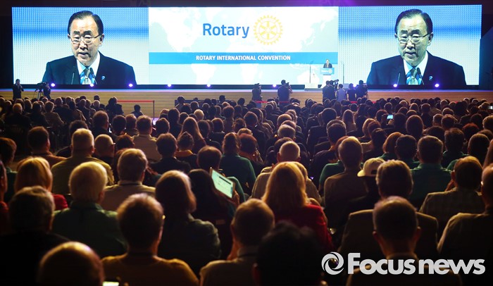 (서울=포커스뉴스) 반기문 유엔 사무총장이 29일 오전 경기 고양시 킨텍스 제1전시장에서 열린 2016 국제로타리 세계대회에 참석해 기조연설 하고 있다.