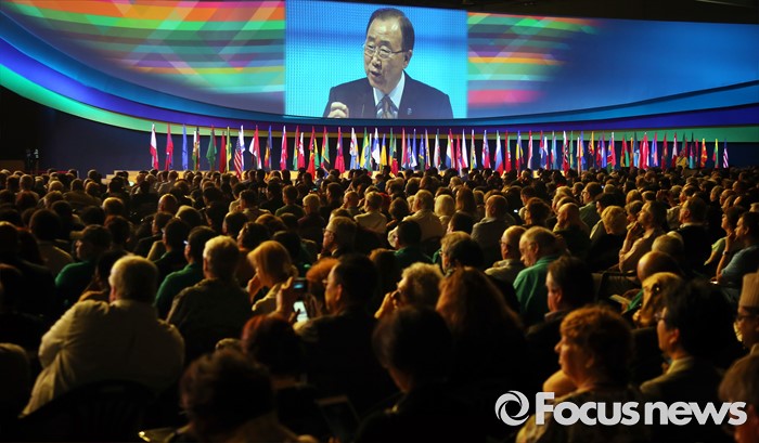 (서울=포커스뉴스) 반기문 유엔 사무총장이 29일 오전 경기 고양시 킨텍스 제1전시장에서 열린 2016 국제로타리 세계대회에 참석해 기조연설 하고 있다.