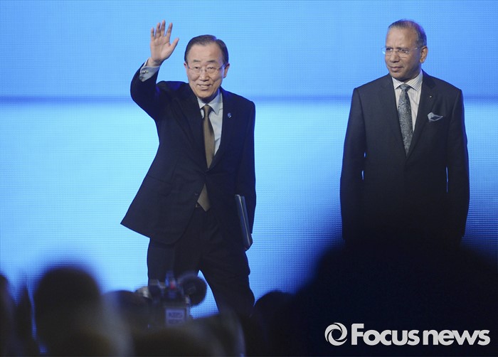 (서울=포커스뉴스) 반기문(왼쪽) 유엔 사무총장이 29일 오전 경기 고양시 킨텍스 제1전시장에서 열린 2016 국제로타리 세계대회에 참석해 기조연설을 마친 후 손을 흔들고 있다. 오른쪽은 K.R. 라빈드란 국제로타리 회장.