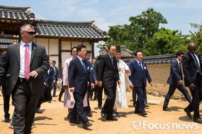 (안동=포커스뉴스) 반기문 UN 사무총장이 29일 오후 경북 안동시 하회마을 방문해 김광림 새누리당 정책위의장, 김관용 경북도지사등과 양진당을 둘러본 뒤 이동 하고 있다.