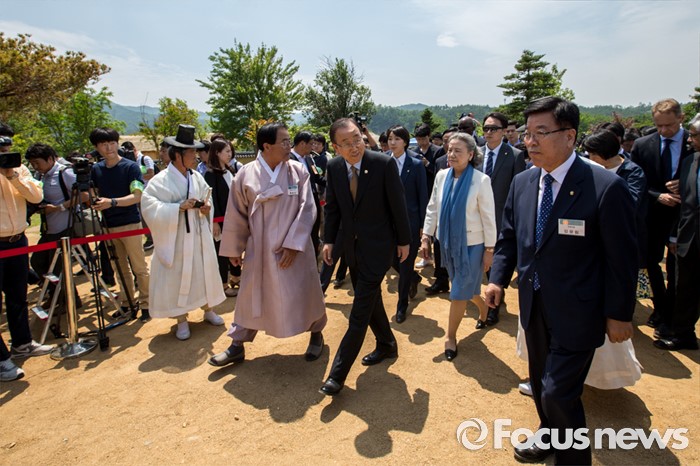 (안동=포커스뉴스) 반기문 UN 사무총장이 29일 오후 경북 안동시 하회마을 방문해 안동충효당으로 향하고 있다.