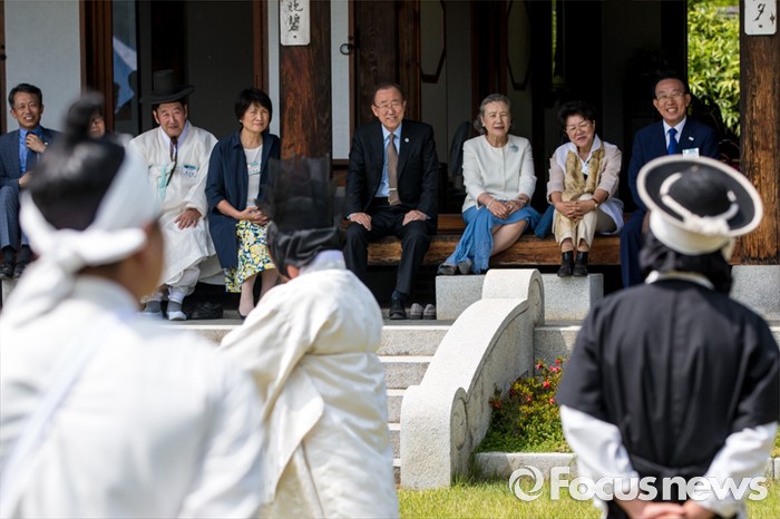 (안동=포커스뉴스) 반기문 UN 사무총장이 29일 오후 경북 안동시 하회마을 방문 하회별신굿탈놀이를 보고 있다.
