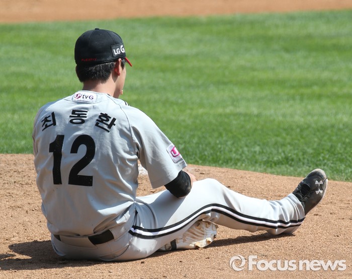 (서울=포커스뉴스) 29일 서울 잠실구장에서 열린 2016프로야구 LG-두산 경기에서 LG 투수 최동환이 동시에 날아온 볼 두개를 피하다 마운드에 주저앉아 있다.