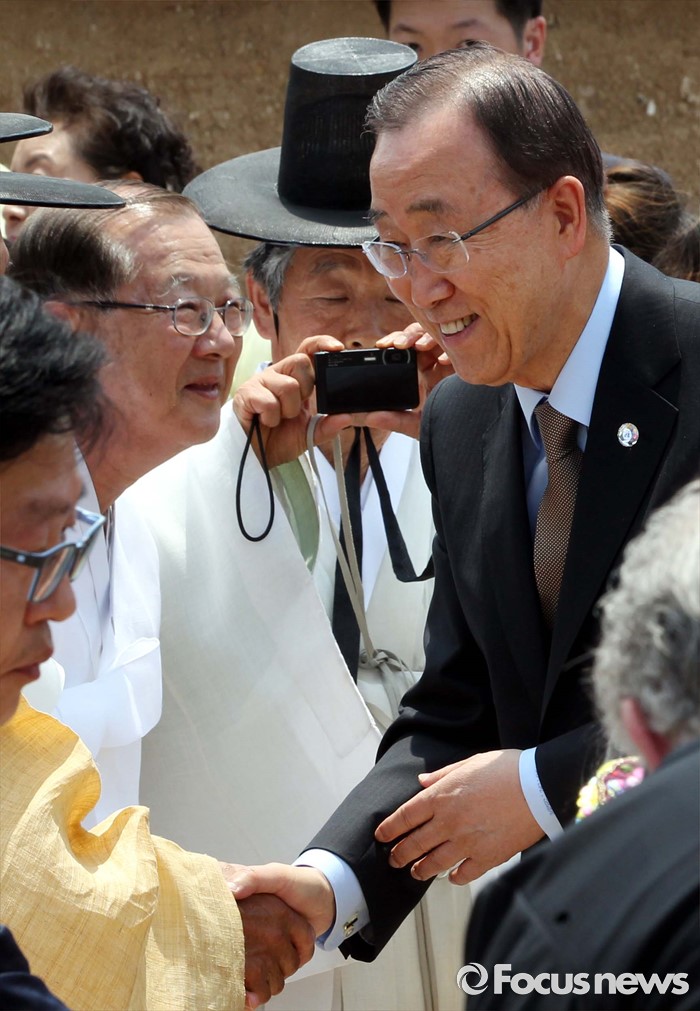 (안동=포커스뉴스) 반기문 유엔 사무총장이 29일 오후 경북 안동 하회마을 충효당을 방문해 시민들과 인사하고 있다.