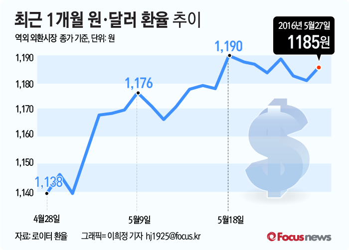 (서울=포커스뉴스) 로이터 통신에 따르면 역외 외환시장에서 원·달러 환율은 27일 종가 1179.3원에서 크게 상승한 1186원선에서 거래됐다.