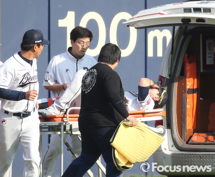(서울=포커스뉴스) 29일 서울 잠실구장에서 열린 2016프로야구 LG-두산 경기 7회초 무사 1,2루에서 LG 유강남의 파울 타구를 잡으려다 펜스에 부딪쳐 오른쪽 무릎을 다친 두산 좌익수 박건우를 구급요원들이 구급차에 태우고 있다.