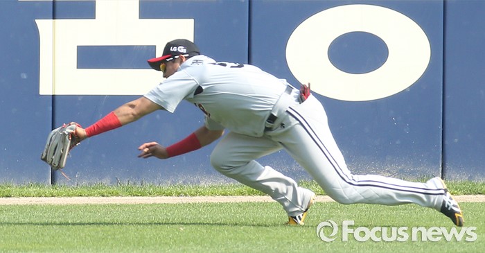 (서울=포커스뉴스) 29일 서울 잠실구장에서 열린 2016프로야구 LG-두산 경기에서 4회말 2사 1루에서 LG 좌익수 채은성이 두산 민병헌의 라인 드라이브 타구를 다이빙하며 잡고 있다.