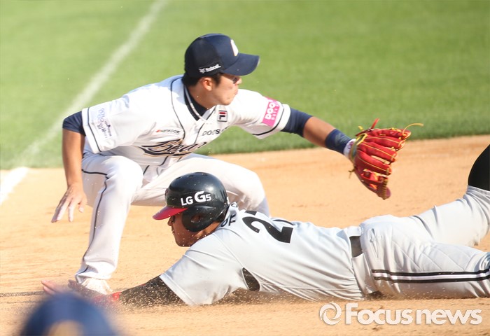 (서울=포커스뉴스) 29일 서울 잠실구장에서 열린 2016프로야구 LG-두산 경기 7회초 무사 2,3루에서 LG 오지환의 중견수 희생플라이때 2루주자 유강남이 3루로 뛰어들어 세이프되고 있다.