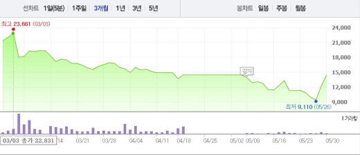 산업은행은 26일 협상이 타결됐다는 일부 보도에 대해 “협상 상황이 진전되고는 있지만, 아직 용선료 조정율 등 합의에 이른 상황은 아니다”라고 말했다.주가흐름<사진출처=네이버 캡쳐>