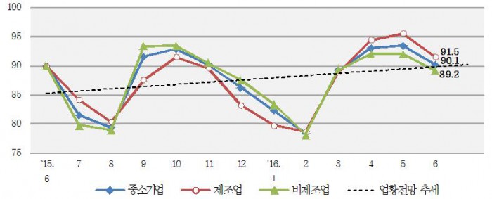 이에 따르면, 6월 중소기업 업황전망 건강도지수(SBHI)는 90.1로 전월대비 3.4p 하락했다. 이중 제조업은 91.5로 전월대비 4.1p, 비제조업은 89.2로 2.8p 떨어졌다.