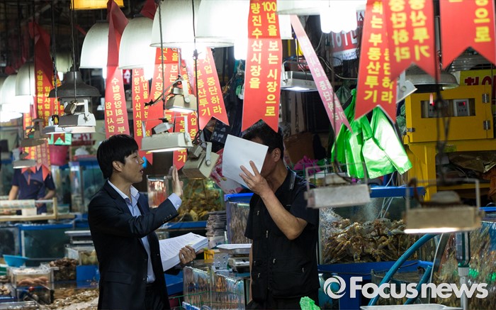(서울=포커스뉴스) 30일 오전 서울 동작구 구 노량진수산시장에서 서울중앙지법 관계자들이 법원의 점유이전금지가처분을 집행하고 있다. 법원은 이날 영업은 지속하되 수협의 동의없이 가게를 타인에게 이전·전대하면 안된다고 상인들에게 통보 했다.