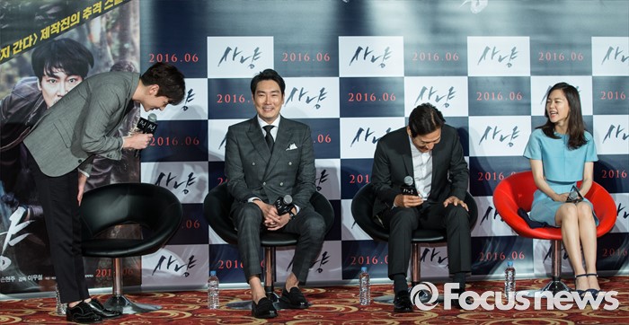 (서울=포커스뉴스) 30일 오전 서울 광진구 건대입구 롯데시네마에서 열린 영화 '사냥' 제작보고회에 참석한 배우 권율이 인사를 하고 있다.