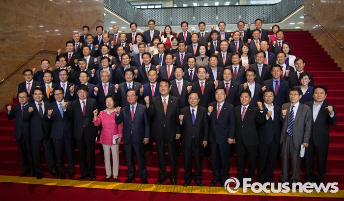 (서울=포커스뉴스) 정진석(앞줄 가운데) 새누리당 원내대표와 김광림 정책위의장을 비롯한 새누리당 의원들이 30일 오전 서울 여의도 국회에서 기념사진을 찍고 있다.