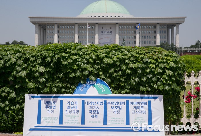 (서울=포커스뉴스) 30일 오전 서울 여의도 국회 앞에 참여연대 등 관련단체 회원들이 20대 국회에서 우선 다뤄야 할 입법·정책과제 제안 및 국회 개혁 촉구 기자회견을 위해 만든 피켓이 놓여 있다.