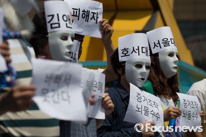 (서울=포커스뉴스) 30일 오후 서울 종로구 광화문 광장에서 환경보건시민센터 관계자들이 옥시 전 사장 검찰소환 조사 촉구하는 기자회견 및 퍼포먼스를 열고 있다.