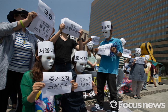 (서울=포커스뉴스) 30일 오후 서울 종로구 광화문 광장에서 환경보건시민센터 관계자들이 옥시 전 사장 검찰소환 조사 촉구하는 기자회견 및 퍼포먼스를 열고 있다.