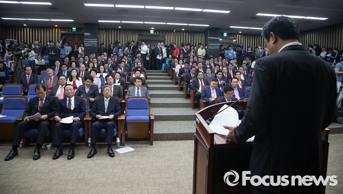 (서울=포커스뉴스) 김희옥(앞줄 왼쪽 세번째) 새누리당 비상대책혁신위원장 내정자와 서청원(앞줄 왼쪽 두번째) 의원이 30일 오전 서울 여의도 국회에서 열린 의원총회에 참석해, 정진석(뒷모습) 원내대표의 발언을 경청하고 있다.