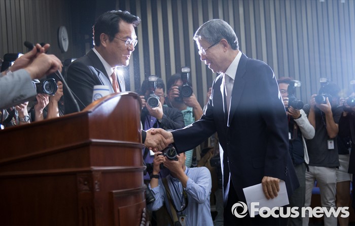 (서울=포커스뉴스) 정진석(왼쪽) 새누리당 원내대표와 김희옥 비상대책혁신위원장 내정자가 30일 오전 서울 여의도 국회에서 열린 의원총회에서 악수하고 있다.