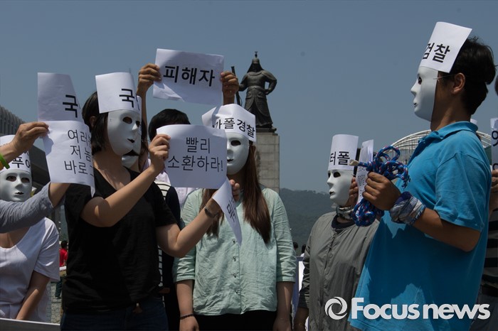 (서울=포커스뉴스) 30일 오후 서울 종로구 광화문 광장에서 환경보건시민센터 관계자들이 옥시 전 사장 검찰소환 조사 촉구하는 기자회견 및 퍼포먼스를 열고 있다.